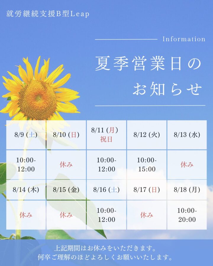 平素より当事業所をご利用いただき、誠にありがとうございます。誠に勝手ながら、下記の期間を夏季休業とさせていただきます。